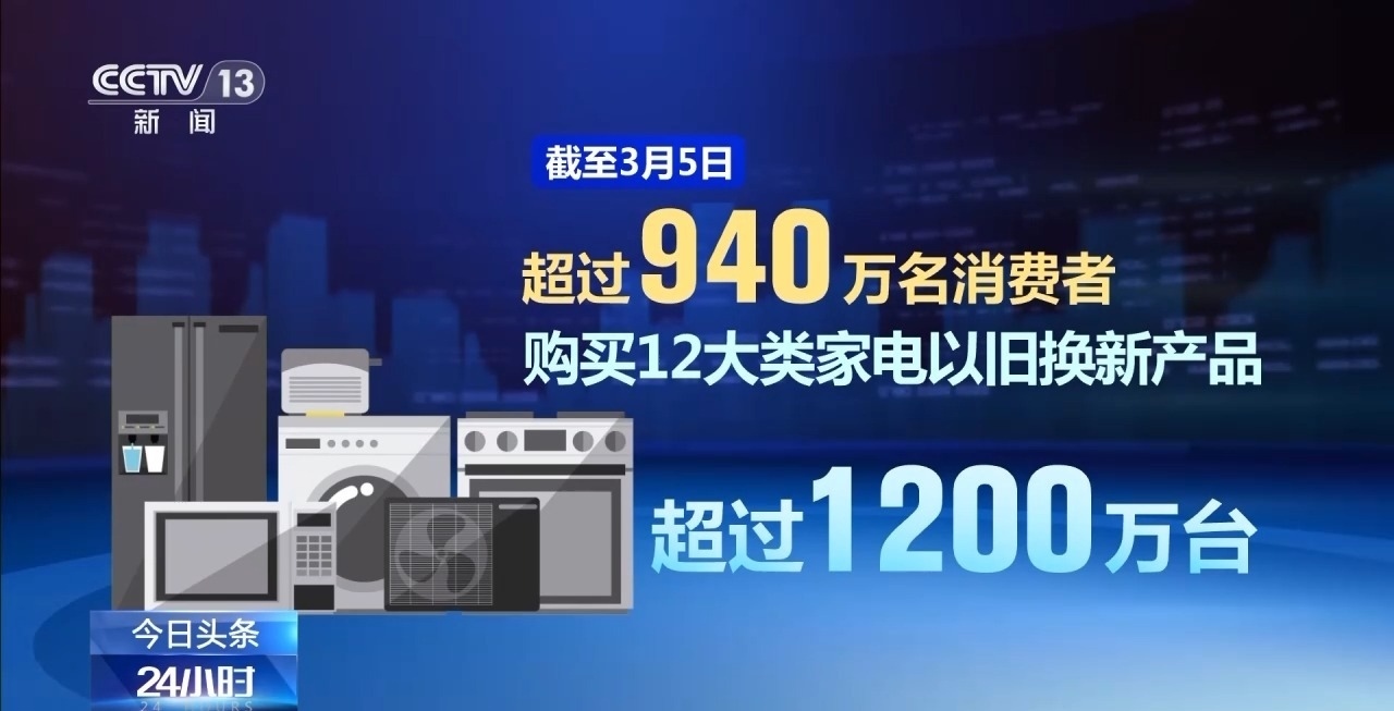 商務部數(shù)據(jù)顯示,截至3月5日,超過940萬名消費者購買12大類家電以舊換新產品超過1200萬臺,已有超過3400萬名消費者申請了超過4200萬件手機等數(shù)碼產品購新補貼。