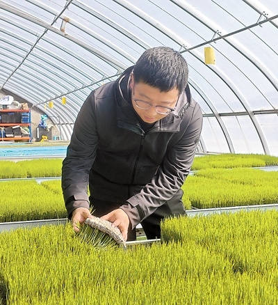 馬巍查看秧苗在生物質(zhì)育苗基質(zhì)上的生長情況。