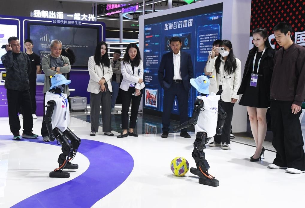 5月8日,機(jī)器人在第二十七屆中國北京國際科技產(chǎn)業(yè)博覽會(huì)大興展臺(tái)展示踢足球。新華社記者 任超 攝
