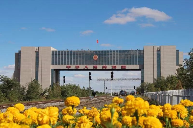 國門莊嚴(yán)肅穆,在國門乳白色的門體上方嵌著"中華人民共和國"7個鮮紅大字,上面懸掛的國徽閃著的金光,國際鐵路在下面通過。國門下方的中蒙鐵路,是連接首都北京和烏蘭巴托、莫斯科的鐵路交通大動脈,被譽(yù)為“歐亞大陸橋”。