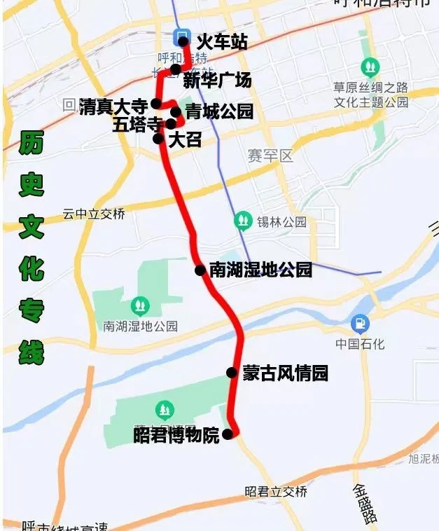 歷史文化專(zhuān)線(火車(chē)站——昭君博物院)途經(jīng):錫林北路、新華大街、通道南路、中山西路、石羊橋路、大東街、大北街、大南街、昭君路。沿途設(shè)站:火車(chē)站、新華廣場(chǎng)、清真大寺、青城公園、五塔寺、大召、南湖濕地公園、蒙古風(fēng)情園、昭君博物院,單程:17.2公里,配車(chē):8臺(tái)。