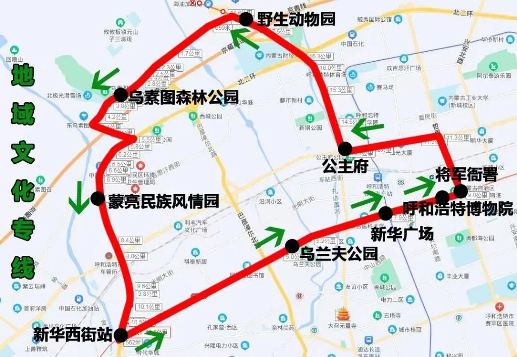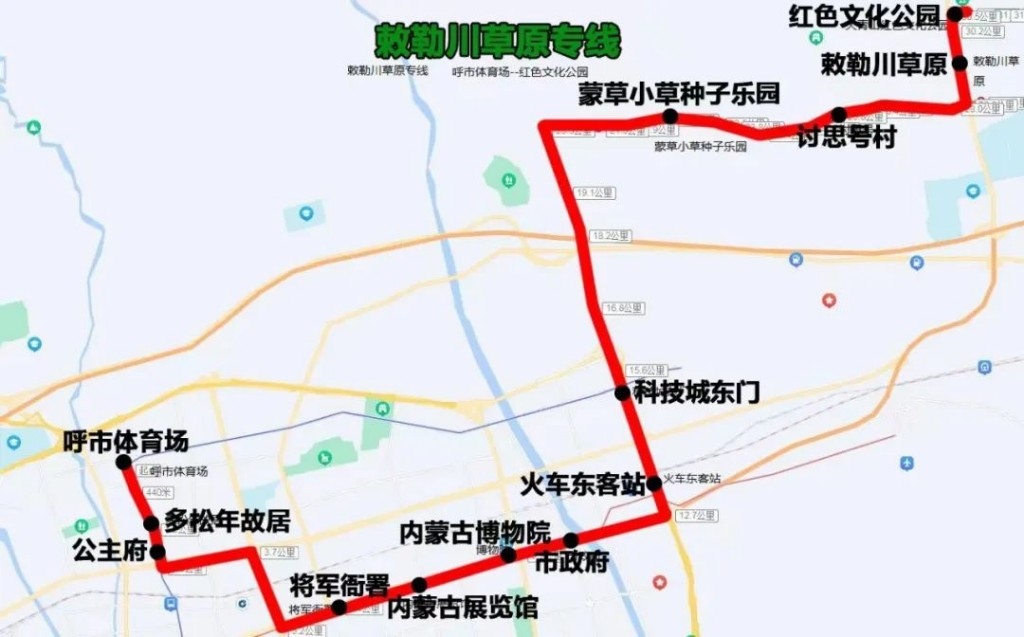 敕勒川草原專(zhuān)線(呼市體育場(chǎng)——紅色文化公園)途經(jīng):氣象局西巷、海拉爾西街、呼倫南路、新華大街、新華東街、科爾沁北路輔道、呼和塔拉西街、呼和塔拉東街、野馬圖、Y371。沿途設(shè)站:呼市體育場(chǎng)、多松年故居、公主府、將軍衙署、內(nèi)蒙古展覽館、內(nèi)蒙古博物院、市政府、火車(chē)東客站、科技城東門(mén)、蒙草小草種子樂(lè)園、討思號(hào)村、敕勒川草原、紅色文化公園,單程:30.5公里,配車(chē):8—10臺(tái)。