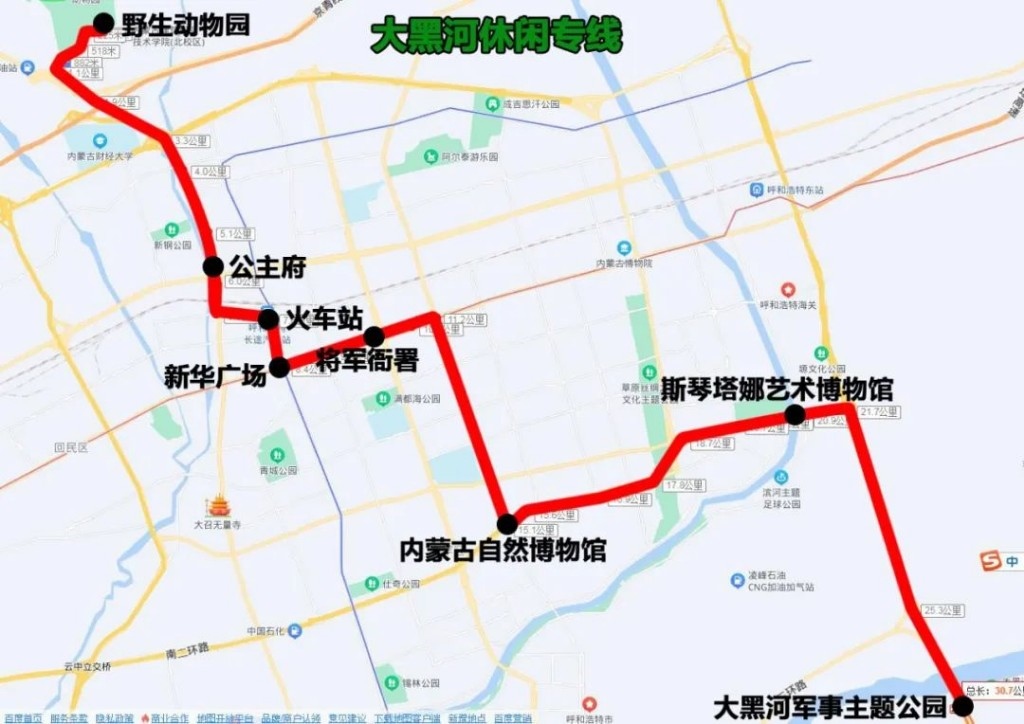 大黑河休閑專(zhuān)線(大青山野生動(dòng)物園——大黑河軍事主題公園),途經(jīng):Y317、通道北路、車(chē)站西街、錫林北路、新華大街、興安南路、金橋路、大黑河北岸路。沿途設(shè)站:野生動(dòng)物園、公主府、火車(chē)站、新華廣場(chǎng)、將軍衙署、內(nèi)蒙古自然博物館、斯琴塔娜藝術(shù)博物館、大黑河軍事主題公園,單程:30.7公里,配車(chē):8—10臺(tái)。