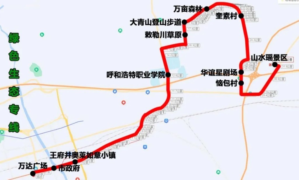 綠色生態(tài)專(zhuān)線(萬(wàn)達(dá)廣場(chǎng)——山水瑤景區(qū))途經(jīng):新華東街、機(jī)場(chǎng)路、S101、呼和塔拉東街、野馬圖路、Y371、惱包路、110國(guó)道、S105省道。沿途設(shè)站:萬(wàn)達(dá)廣場(chǎng)、市政府、王府井奧萊如意小鎮(zhèn)、呼和浩特職業(yè)學(xué)院、敕勒川草原、大青山登山步道、萬(wàn)畝森林、奎素村、華誼星劇場(chǎng)、惱包村、山水謠景區(qū),單程:33公里,配車(chē):8—10臺(tái)。