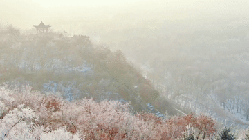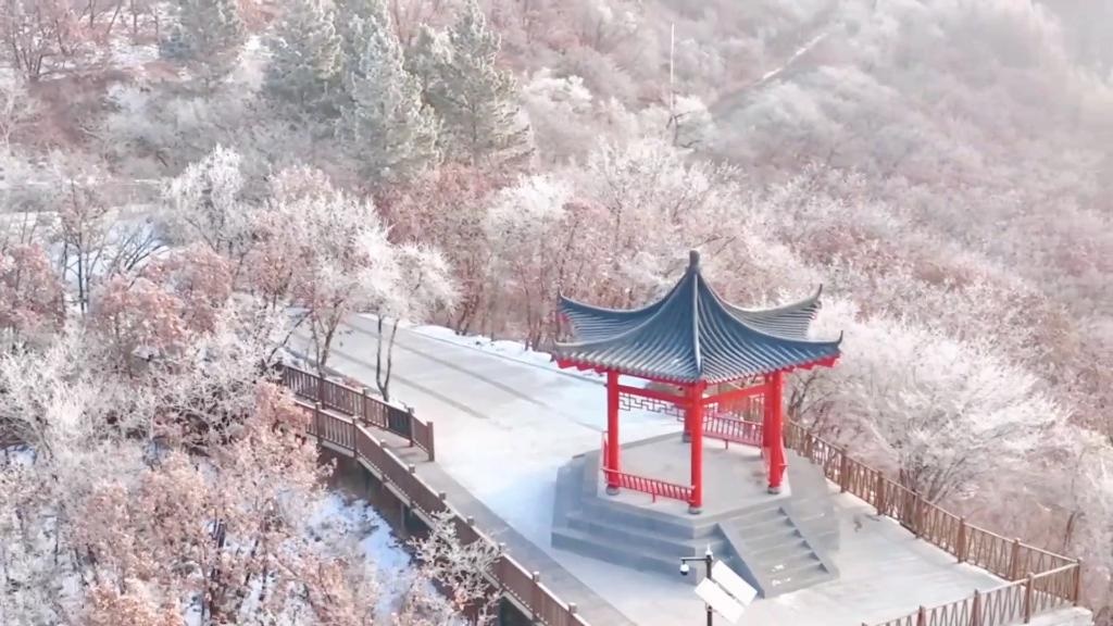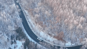 山峰、樹木都被冰雪點綴,粉妝玉砌,銀光閃爍。晶瑩剔透的霧凇與蜿蜒的山路交相輝映,構成了一幅壯觀的冬雪美麗畫卷。