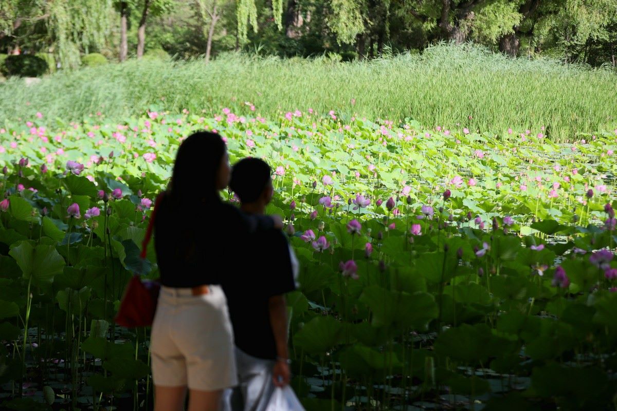 7月8日,游客在呼和浩特青城公園觀賞荷花