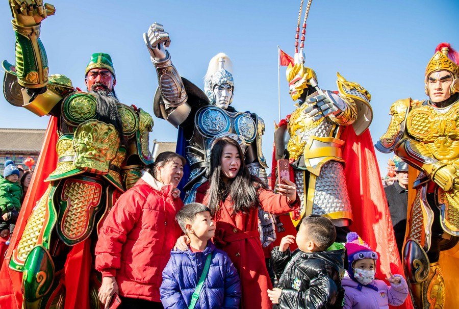 2024年2月15日,人們在呼和浩特市玉泉區(qū)塞上老街旅游休閑街區(qū)與國風(fēng)機甲拍照留影。丁根厚 攝
