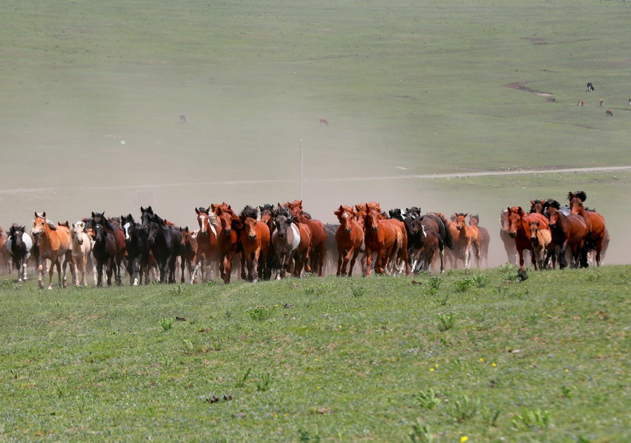 活動(dòng)現(xiàn)場(chǎng)尤為引人注目的還有“萬(wàn)馬奔騰”表演,只見騎手們頭纏彩巾,揚(yáng)鞭策馬,他們身旁,近萬(wàn)匹馬兒在騎手的驅(qū)趕下奔馳而來,馬蹄聲下草原上揚(yáng)起陣陣沙塵,十分壯觀。