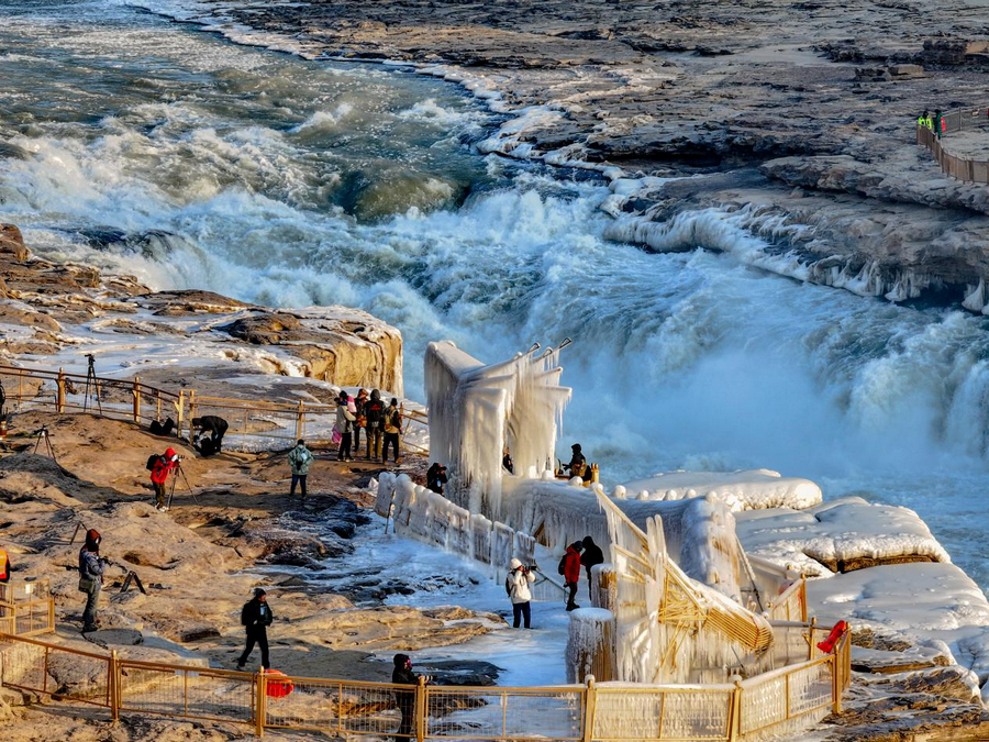 2月6日,受近日持續(xù)降溫天氣影響,位于秦晉大峽谷的陜西壺口瀑布景區(qū)出現(xiàn)冰瀑玉壺景觀。從空中俯瞰,滔滔黃河水奔騰咆哮,場面蔚為壯觀,飛濺起的浪花和彌漫的水霧在兩岸巖石和護(hù)欄上迅速凝結(jié),形成形狀各異的冰掛,晶瑩剔透,美不勝收,飛瀑上空偶現(xiàn)的彩虹與冰掛同框,交相輝映。由于近期黃河水流量上漲,達(dá)到700立方米每秒,景區(qū)主側(cè)瀑布攜手傾瀉,呈現(xiàn)“90版50元人民幣”上的壯美瀑布景觀,游客一次旅程可觀看雙瀑奇觀。