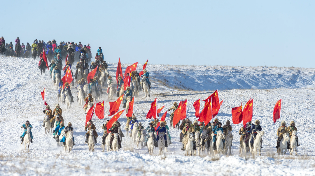 9時(shí)50分,在護(hù)旗方陣的護(hù)衛(wèi)下,鮮艷的五星紅旗冉冉升起,《義勇軍進(jìn)行曲》響徹云霄,萬(wàn)人肅立齊唱。方陣入場(chǎng)式上,200名農(nóng)牧民手持火紅的辣椒、金黃的向日葵和飽滿的西瓜,用豐收的喜悅“描繪”鄉(xiāng)村振興畫(huà)卷;400名“民族大家庭”方陣成員身著五彩盛裝,恰似民族團(tuán)結(jié)的斑斕錦緞;企業(yè)代表、干部職工代表、裁判、射箭手、搏克手等方陣依次入場(chǎng),大家精神抖擻,昂首闊步,展現(xiàn)出全旗各族人民團(tuán)結(jié)奮進(jìn)的精神面貌;最令人心潮澎湃的當(dāng)數(shù)蒙古馬方陣——百匹駿馬踏著《黑駿馬》的悠揚(yáng)琴聲奔騰而來(lái),馬蹄卷起草浪,鬃毛飛揚(yáng)如旗,將北疆兒女的豪邁氣概演繹得淋漓盡致。