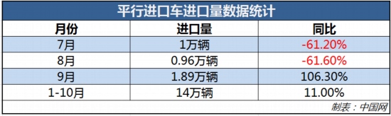 除了新能源汽車(chē)進(jìn)口量增長(zhǎng),平行進(jìn)口車(chē)也成為了一大亮點(diǎn)。根據(jù)數(shù)據(jù)顯示,今年7、8月份,我國(guó)平行進(jìn)口車(chē)在進(jìn)口車(chē)市場(chǎng)中成績(jī)還屬較差。其中,7月份平行進(jìn)口車(chē)進(jìn)口量約為1萬(wàn)輛,同比下滑了61.2%;8月份平行進(jìn)口車(chē)進(jìn)口量也不理想,僅有9600輛,同比下滑了61.6%。但就在9月份,平行進(jìn)口車(chē)數(shù)量則出現(xiàn)了大幅攀升。根據(jù)國(guó)機(jī)汽車(chē)數(shù)據(jù)統(tǒng)計(jì),9月份我國(guó)平行進(jìn)口汽車(chē)進(jìn)口量約為1.89萬(wàn)輛,同比大增106.3%。今年1-10月,平行進(jìn)口車(chē)數(shù)量共14.0萬(wàn)輛,同比上漲了11.0%,占進(jìn)口總量的16%。詳情見(jiàn)下表: