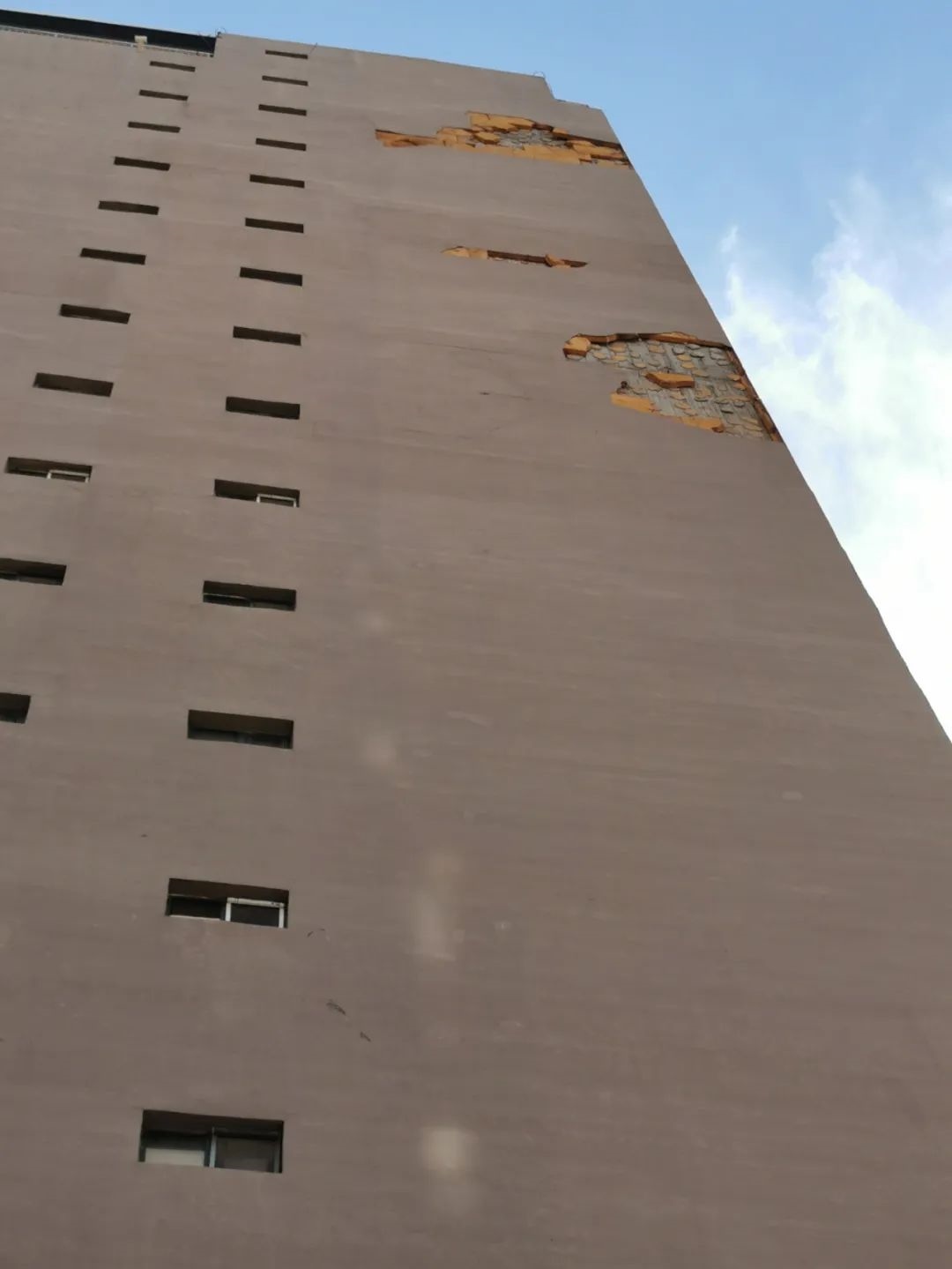 7月1日10時(shí)許,記者來到聞都雅苑4號(hào)樓下,抬頭望去,該棟樓西側(cè)墻壁有三處地方出現(xiàn)破損,大片的墻皮和里面的保溫層均已脫落。記者注意到,聞都雅苑共有4棟高層,該小區(qū)只有東西和南北兩條主干道以及西側(cè)一條小走廊,而4號(hào)樓正好位于南北主干道一側(cè)。據(jù)小區(qū)居民郝先生介紹,不斷掉落的保溫層已經(jīng)威脅到了居民的人身安全。今年5月6日,呼和浩特市出現(xiàn)大風(fēng)天氣,在風(fēng)力的作用下,4號(hào)樓東西兩側(cè)的外墻保溫層出現(xiàn)大面積脫落,一位恰巧路過4號(hào)樓西側(cè)的女性業(yè)主不幸被掉落的材料砸中,導(dǎo)致腿部受傷,此事也給小區(qū)居民帶來了恐慌。