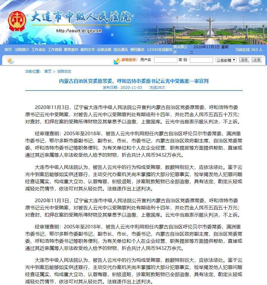2020年11月3日,遼寧省大連市中級人民法院公開宣判內(nèi)蒙古自治區(qū)黨委原常委、呼和浩特市委原書記云光中受賄案,對被告人云光中以受賄罪判處有期徒刑十四年,并處罰金人民幣五百五十萬元;對查封、扣押在案的受賄所得財物及其孳息予以追繳,上繳國庫。云光中當庭表示服從判決,不上訴。