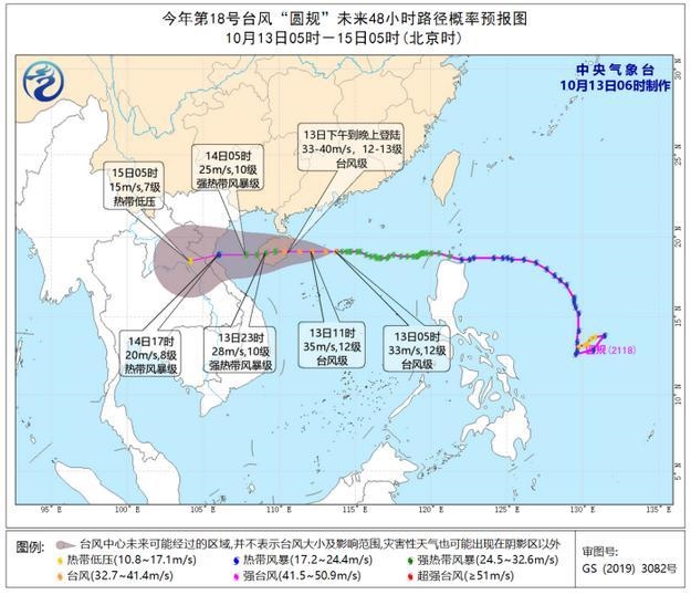 預(yù)計(jì),“圓規(guī)”將以每小時(shí)25-30公里的速度向偏西方向移動(dòng),強(qiáng)度還將有所加強(qiáng),將于13日下午到晚上在海南文昌到陵水一帶沿海登陸,登陸強(qiáng)度為臺(tái)風(fēng)級(jí)(12-13級(jí),33-40米/秒)。登陸后,強(qiáng)度逐漸減弱,穿過(guò)海南島,14日凌晨移入北部灣,然后趨向越南北部。