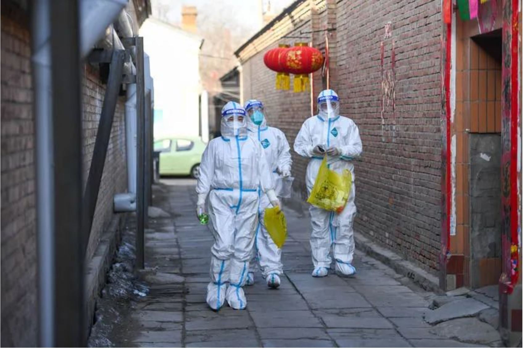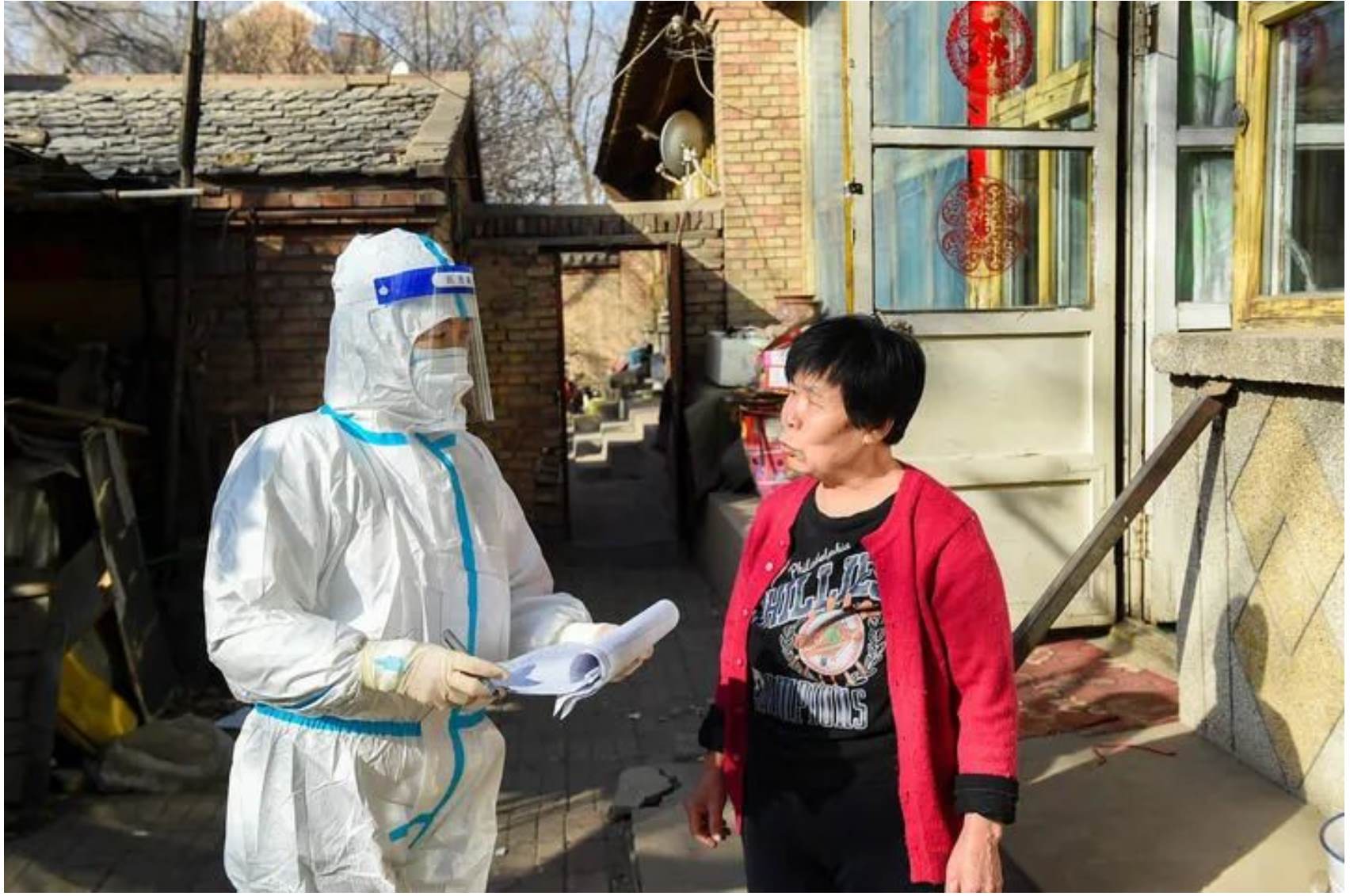 ↑3月6日,在呼和浩特市賽罕區(qū)東瓦窯社區(qū),網格員(左)帶領醫(yī)務工作者為次密接群眾上門做核酸檢測。