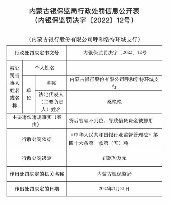 貸后管理不到位 內(nèi)蒙古銀行呼和浩特環(huán)城支行被罰30萬元