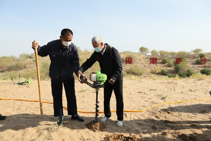 “我們目前栽植沙柳,常用的方法是‘螺旋鉆植樹法’和‘微創(chuàng)氣流植樹法’?!痹趲觳计渖衬纳撤寰G谷,常朝暉的團隊向探訪團成員演示沙柳的種植方法?!奥菪@植樹法”是用微動力帶動螺旋鉆打孔,插入樹苗,再夯實沙土,而“微創(chuàng)氣流植樹法”,用加壓水槍噴射的水氣流在沙地上沖出直徑幾厘米、深1米的小洞,然后將樹苗快速插進去,挖坑、栽樹、回填、澆水,差不多10秒鐘即可種完一株沙柳。這兩種“微創(chuàng)”植樹技術(shù),為“螞蟻森林”的成活率提供技術(shù)保障。