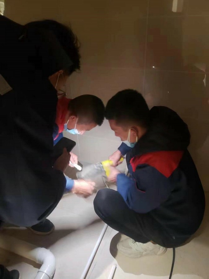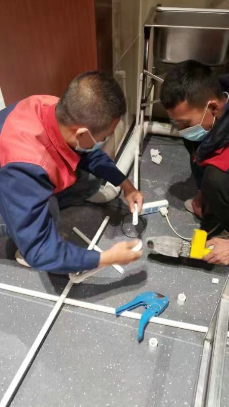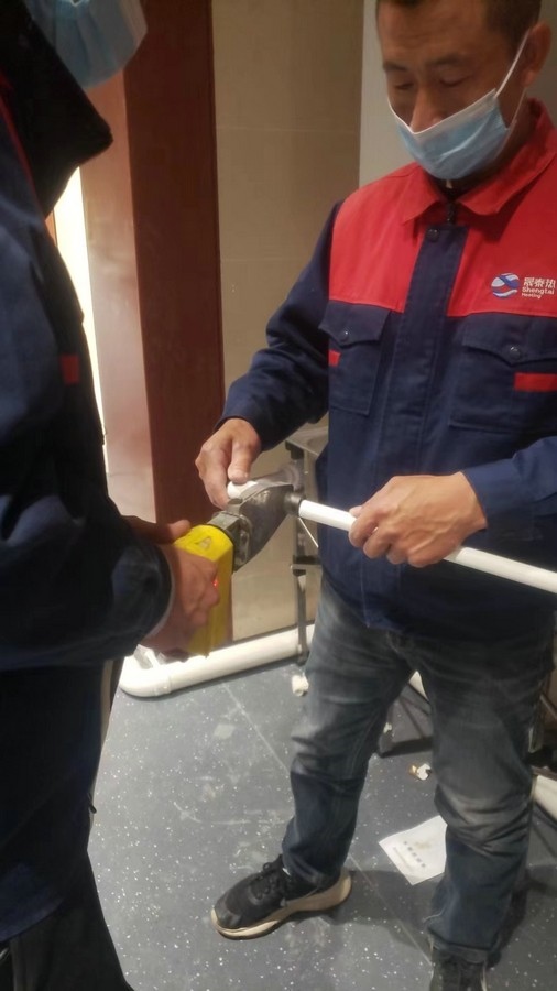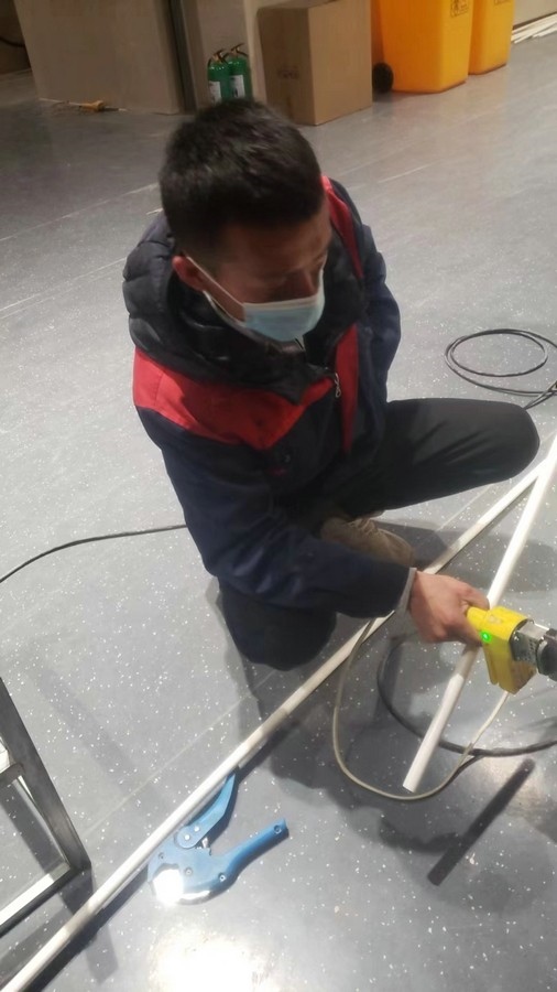 深夜,氣溫突降,冷風毫不留情地灌入現場施工人員的衣服里,但無一人松勁、無一人退縮。由于材料分布范圍較大,只見身穿紅、藍工作服的他們徒步穿梭于各樓層之間,一刻不停地搬運管件及材料、安裝設備。因疫情管控不能到現場的同事則堅持利用通訊工具提供遠程技術支持,為前線答疑解惑。方艙醫(yī)院建設屬于應急工程,時間緊、任務重,加之現場材料缺乏,施工人員只能就地取材,爭分奪秒的同時,“突擊隊”表現出了高度的專業(yè)性,迅速、細致、高效地進行管道鋪設和熱水器安裝……凌晨4點,在現場全體施工人員的共同努力下,方艙醫(yī)院水暖安裝工作順利完成。