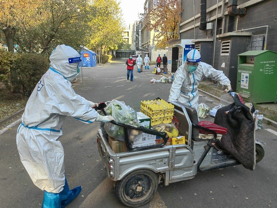 即使單元出現陽性病例,田宇依舊穿著防護服,佩戴好口罩,第一時間將物資運送到位。有時物資集中配送,田宇需要往返多次搬運大量的物資。有時鄰居填錯地址,還需要到別的居民樓幫忙找尋。但她從未有過一句怨言,面對鄰居們的感謝和贊揚,她總是憨厚地和大家說“不要客氣”。當鄰居們因為小區(qū)的封控管理或物資短缺產生焦慮或不滿時,她也會在第一時間解釋說明,疏導大家的情緒。