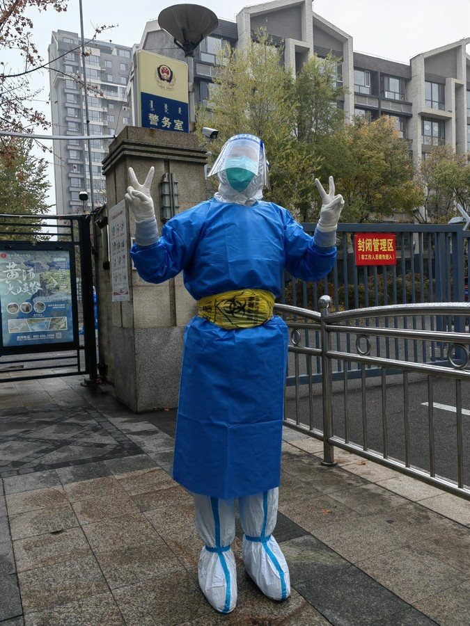 呼和浩特的深秋,夜涼如水,脫去防護服的她來不及換上厚衣服,她只好將未使用的垃圾袋披在身上保暖。