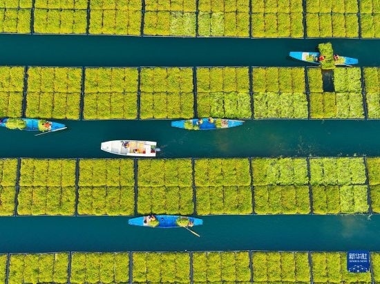 2月17日,浙江省杭州市淳安縣千島湖鎮(zhèn)坪山生態(tài)浮島上,工作人員忙著采摘水生蔬菜(無(wú)人機(jī)照片)。