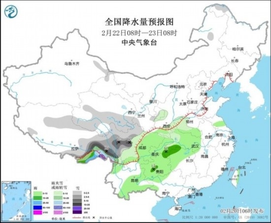 全國降水量預(yù)報圖(2月22日08時-23日08時)。圖片來源:中央氣象臺網(wǎng)站