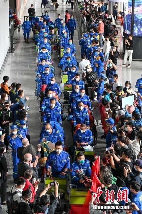 2月19日,廣東省廣州市,藍(lán)天救援隊赴土耳其隊員抵達(dá)廣州白云機(jī)場。當(dāng)日,100余名藍(lán)天救援隊赴土耳其隊員搭乘CZ8066航班返抵廣州。中新社記者 陳驥旻 攝