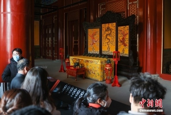 北京景山公園,市民參觀壽皇殿內(nèi)的插屏。中新社記者 易海菲 攝