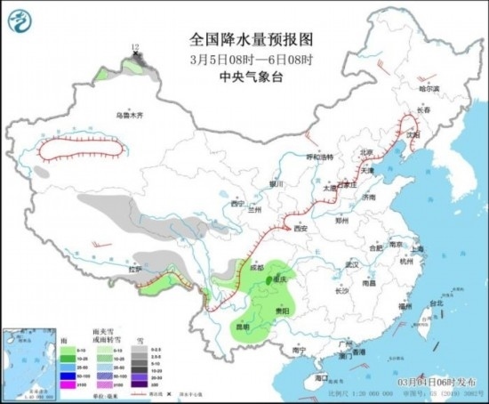 全國降水量預(yù)報圖(3月5日08時-6日08時)