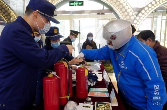 3月14日,一名快遞員(右)在宣傳攤位前體驗滅火器的使用方法。