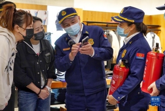 3月14日,消防支隊防火監(jiān)督員(中)為商場商戶講解如何使用手機掃碼方式辨別消防產(chǎn)品真?zhèn)巍?/p>