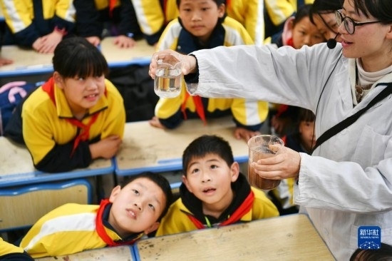 3月22日,在四川省廣安市前鋒區(qū)前鋒小學(xué),老師在向?qū)W生展示過(guò)濾前后的水質(zhì)變化。