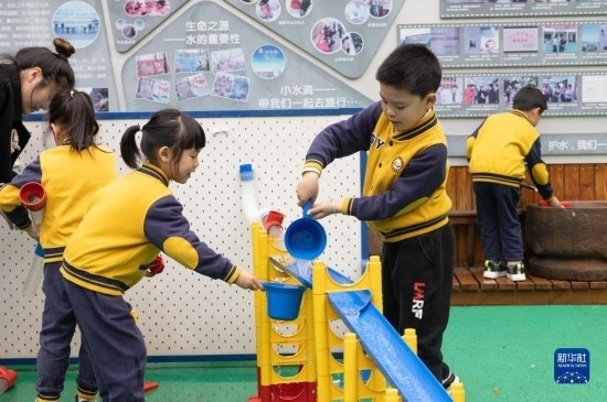 3月22日,浙江省諸暨市實(shí)驗(yàn)幼兒園的小朋友在體驗(yàn)?zāi)M水循環(huán)裝置。