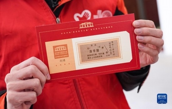 3月25日,在清華園車站舊址的專題展覽廳內(nèi),一名志愿者展示印有“老車票”的紀念卡片。