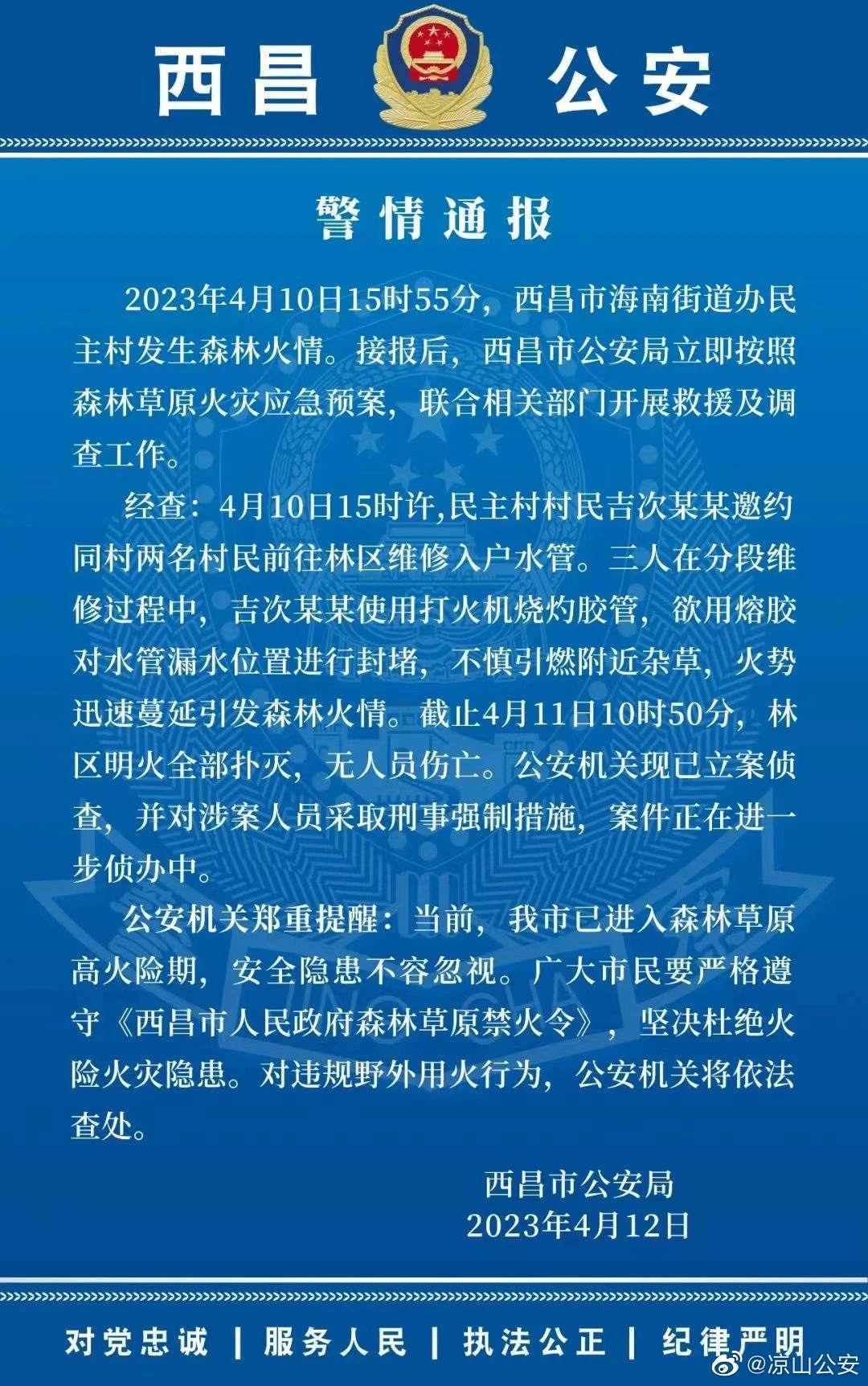 ·西昌警方通報森林火災(zāi)調(diào)查:村民燒灼膠管修水管引燃雜草,涉案人員被控制。