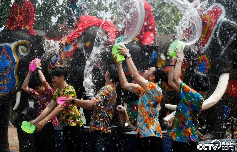 當(dāng)?shù)貢r間2023年4月11日,泰國大城府,大象與游客相互潑水,歡度潑水節(jié)。