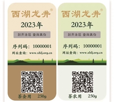 “專用標(biāo)識分為‘證明標(biāo)N(茶農(nóng)用)’和‘證明標(biāo)Q(企業(yè)用)’兩種樣式,相當(dāng)于西湖龍井茶的一張‘身份證’,上面包含了使用主體、年份、規(guī)格、編號、防偽信息等內(nèi)容?!本皡^(qū)執(zhí)法隊提醒,龍井茶大量上市時期,購買正宗西湖龍井需認(rèn)準(zhǔn)專用標(biāo)識。