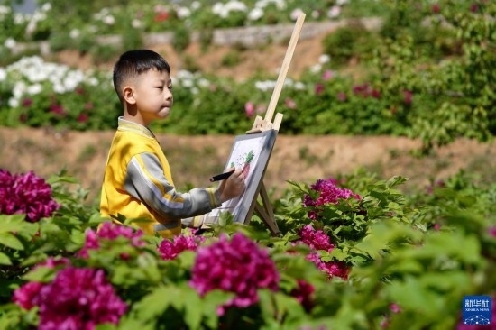 4月16日,小朋友在白臺峪村牡丹農業(yè)產(chǎn)業(yè)園內寫生。
