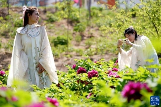 4月16日,游客在白臺峪村牡丹農業(yè)產(chǎn)業(yè)園拍照游玩。