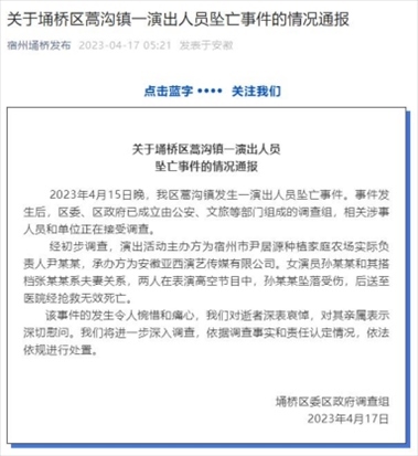 ·安徽宿州埇橋區(qū)委區(qū)政府調查組通報“雜技演員墜亡”:涉事人員和單位接受調查。