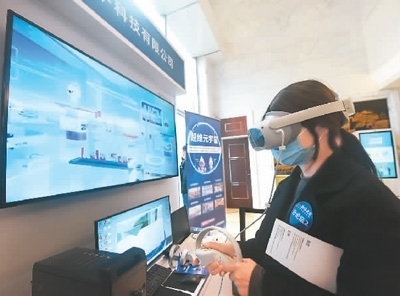 3月29日,在河北省雄安新區(qū)生態(tài)環(huán)境監(jiān)測(cè)中心內(nèi),環(huán)境監(jiān)測(cè)員借助VR(虛擬現(xiàn)實(shí))設(shè)備輔助開(kāi)展工作。本報(bào)記者 史自強(qiáng)攝