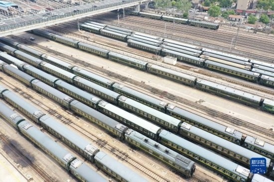 4月28日拍攝的中國(guó)鐵路上海局集團(tuán)有限公司徐州站客車整備場(chǎng)內(nèi)的臨時(shí)旅客列車(無(wú)人機(jī)照片)。