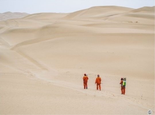 圖⑤東方地球物理公司新疆塔里木物探處的工人馮永生(前)、馮雙生(中)、馮志鵬在沙漠中進(jìn)行測量定位,標(biāo)記鉆井點(diǎn)。新華社發(fā)