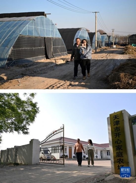 拼版照片:上圖為呂欣和丈夫馮愛喜通過(guò)直播介紹自家種植藍(lán)莓的大棚(2022年12月6日攝);下圖為呂欣和丈夫馮愛喜一起走出家庭農(nóng)場(chǎng)(5月3日攝)。
