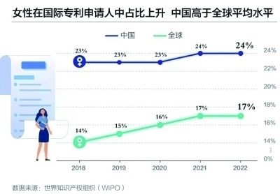 世界知識(shí)產(chǎn)權(quán)組織數(shù)據(jù)顯示,2021年,中國(guó)是全球國(guó)際專利(PCT)女性申請(qǐng)人的最大來(lái)源地。2022年,中國(guó)女性發(fā)明者所占比例為24%,高于全球平均水平。