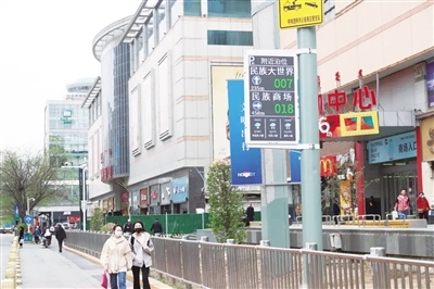 5月7日上午,在中山西路,記者看到懸掛的智能停車指引屏上顯示附近停車場的位置,以及停車場的停車位余量。維多利購物中心附近的一個智能停車指引屏上顯示民族大世界有7個空余停車位、民族商場有18個空余停車位,而這些數(shù)據(jù)也在實時更新,市民根據(jù)智能停車指引屏的信息便能輕松找到停車位,不用再為停車難而發(fā)愁。