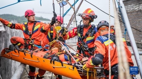 六盤水消防救援支隊(duì)隊(duì)員在轉(zhuǎn)運(yùn)“受傷人員”(5月11日攝)。