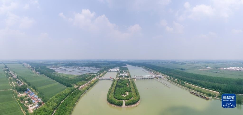 這是位于江蘇省泗洪縣的南水北調(diào)東線一期工程泗洪站樞紐(無人機(jī)全景照片,5月12日攝)。新華社發(fā)(方東旭攝)