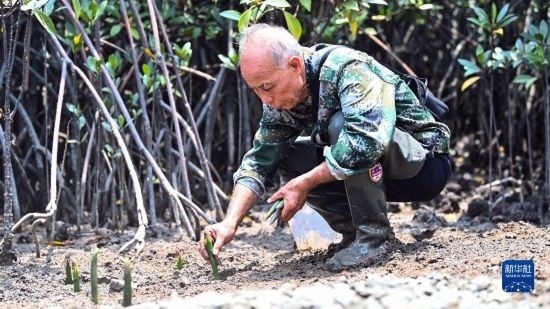 莫積瑞老人護(hù)理紅樹林小苗(5月20日攝)。