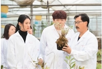 萊蕪職業(yè)技術(shù)學(xué)院教授王鋒祥(右)在進(jìn)行鐵皮石斛種植技術(shù)指導(dǎo)。周美棟攝